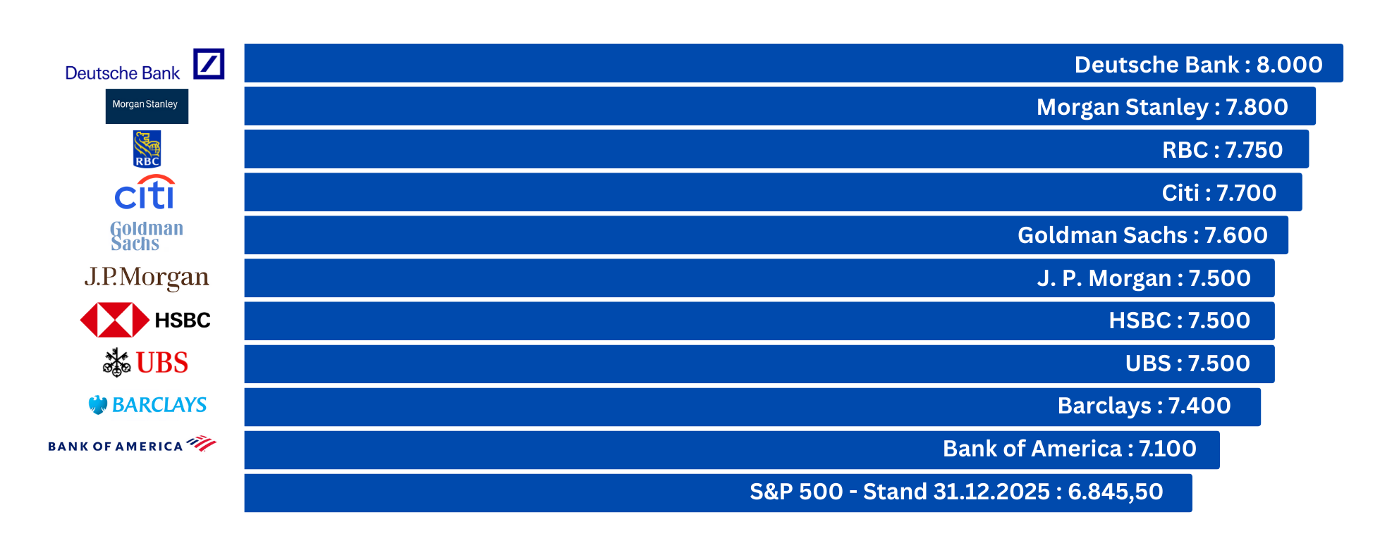 Auch in diesem Jahr fallen die Prognosen der großen Bankhäuser für den S&P 500 optimistisch aus (siehe Chart). Im Durchschnitt erwarten die aufgeführten Banken für das Jahr 2026 einen Anstieg des S&P 500 auf 7.585 Punkte. Das entspräche einer Rendite von ca. 10,8% gegenüber dem Schlusskurs von 2025.